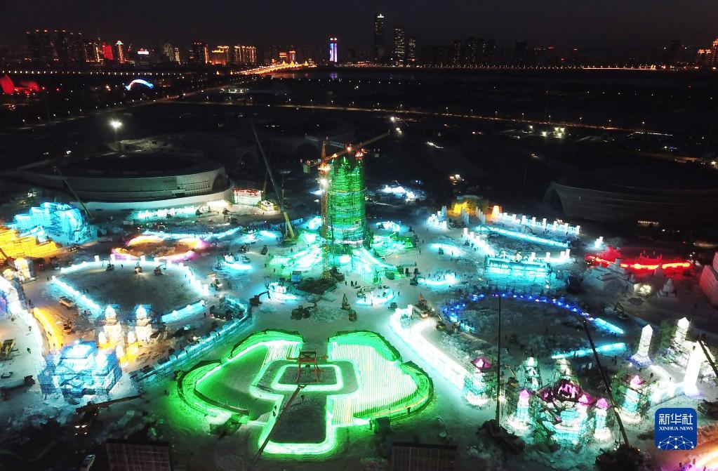 施工建設中的哈爾濱冰雪大世界園區主塔“冰雪之冠”(12月8日攝,無人機照片)。