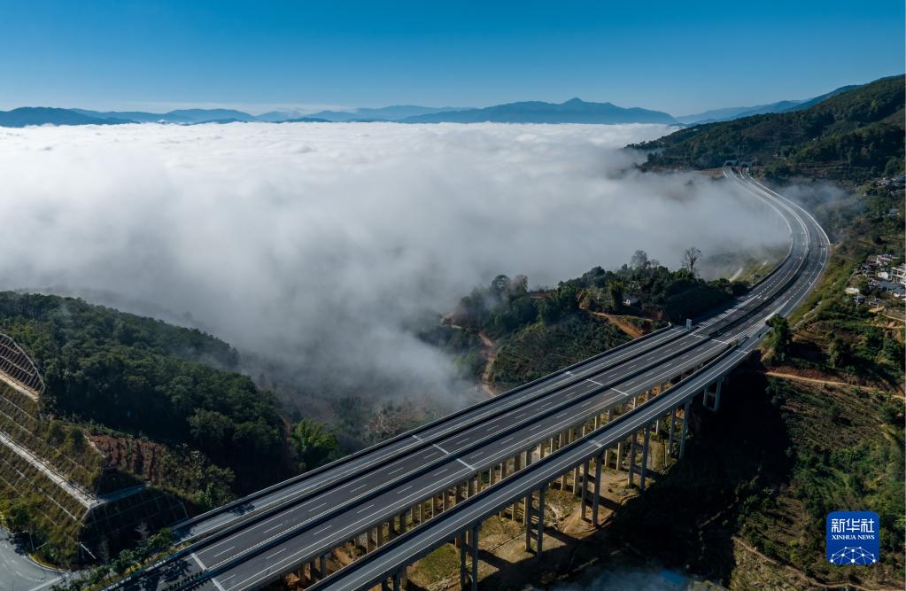 這是在云南省臨滄市拍攝的云海間的天猴高速(12月8日攝,無人機照片)。
