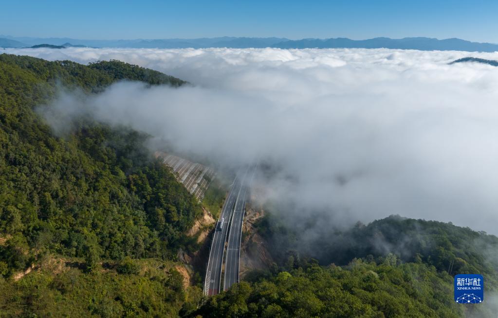 在云南省臨滄市一處公路,汽車穿行在云海間(12月10日攝,無人機照片)。