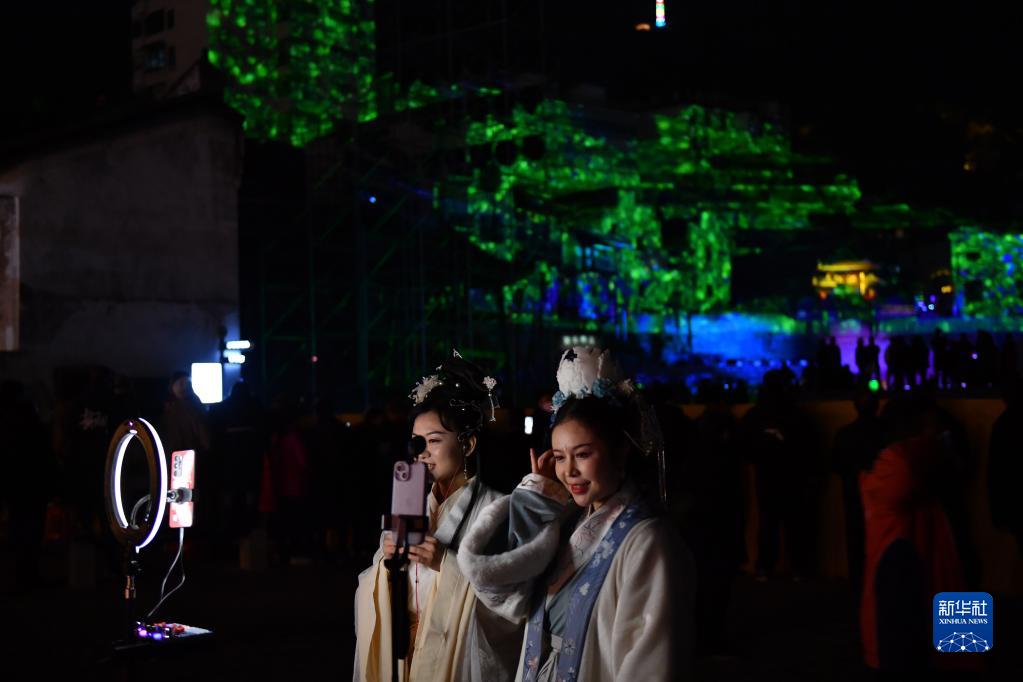 12月9日,游客在湖南懷化洪江古商城游玩、直播。
