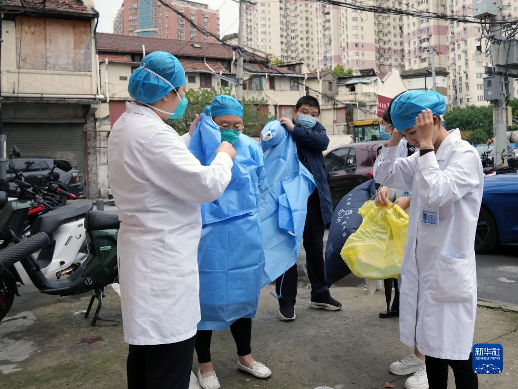 在黃浦區順昌路上,接種小分隊的醫護人員在小區門口穿戴隔離衣物(12月5日攝)。