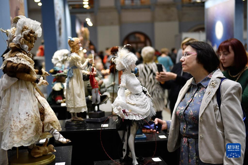 12月10日,參觀者在俄羅斯莫斯科玩偶藝術展上觀看展品。