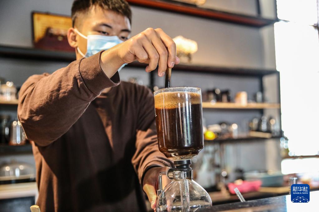 12月10日,在位于海南澄邁的才存咖啡館,返鄉大學生、咖啡師徐取凡在煮咖啡。