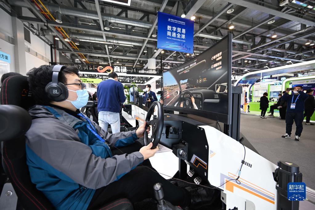 12月12日,工作人員在首屆全球數字貿易博覽會上展示虛擬駕駛系統。