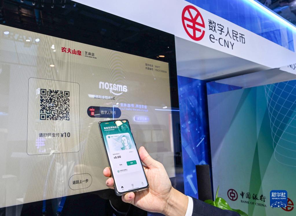 12月12日,工作人員在首屆全球數字貿易博覽會上展示數字人民幣的應用場景。