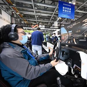 12月12日,工作人員在首屆全球數字貿易博覽會上展示智能港口無人駕駛集卡車控制系統。