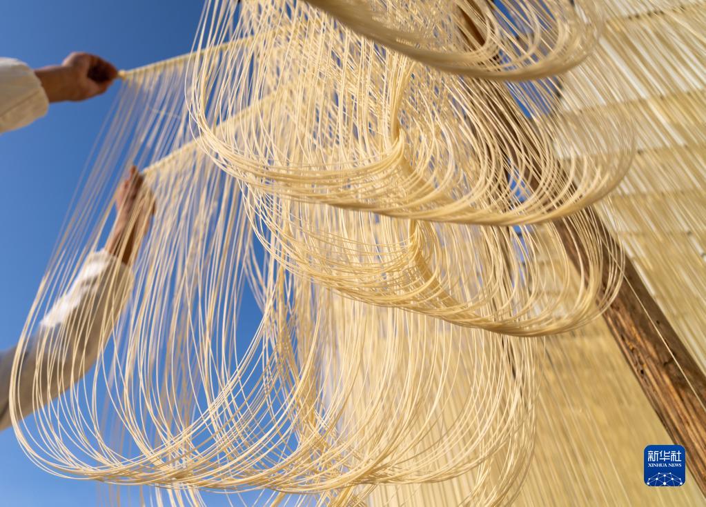 12月12日,在竹塘社區掛面合作社的掛面車間,工人將掛面上架晾曬。
