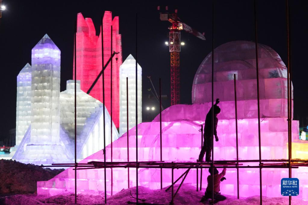 12月11日,工作人員在哈爾濱冰雪大世界園區內施工。