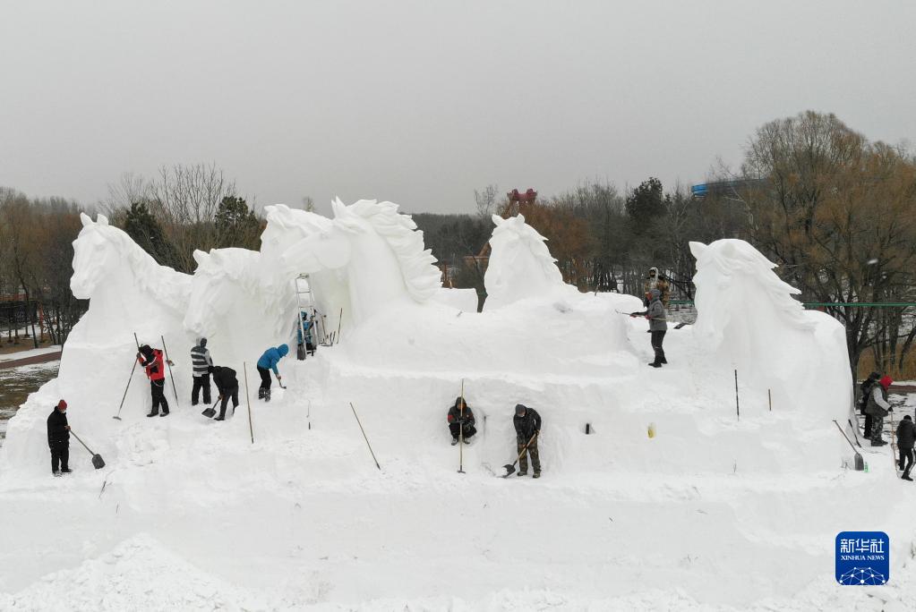 12月12日,工作人員在太陽島雪博會園區制作雪雕(無人機照片)。