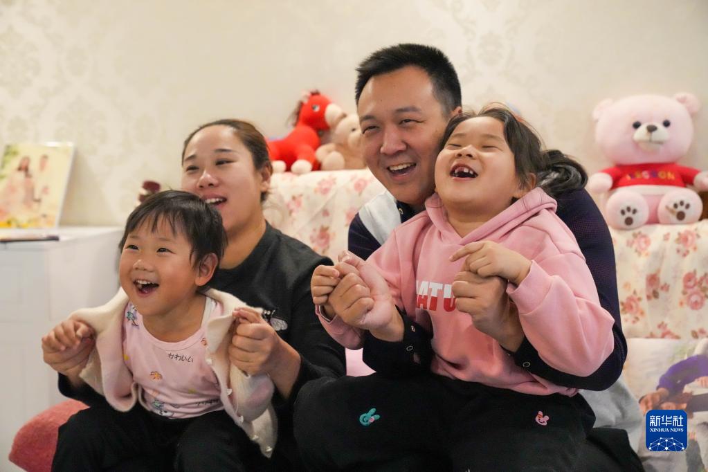 蔡成(右二)與妻子和女兒們在家中收聽、觀看卡塔爾世界杯小組賽比賽(12月1日攝)。