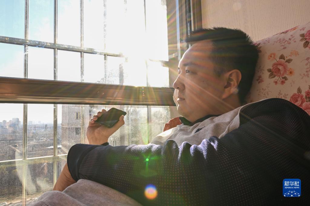 蔡成通過智能手機收聽卡塔爾世界杯一場小組賽的賽后解說(12月1日攝)。