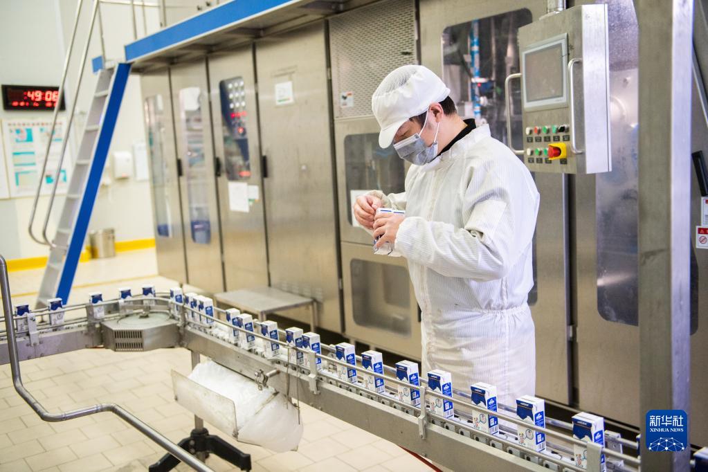 12月13日,在皇氏集團湖南優氏乳業有限公司飲品生產車間,工作人員在檢查產品質量。