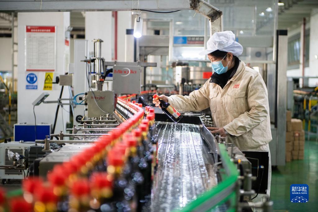 12月13日,在加加食品集團股份有限公司醬油生產車間,工作人員在檢查醬油品質。