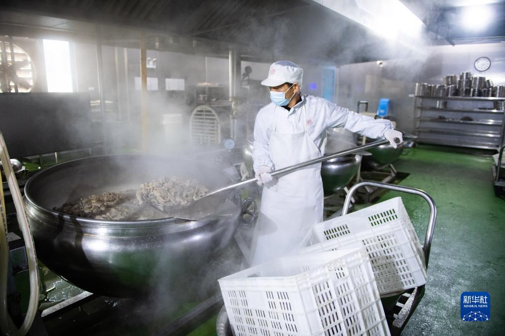 12月13日,在湖南彭記坊農業科技發展有限公司預制菜生產車間,工作人員在烹飪食材。