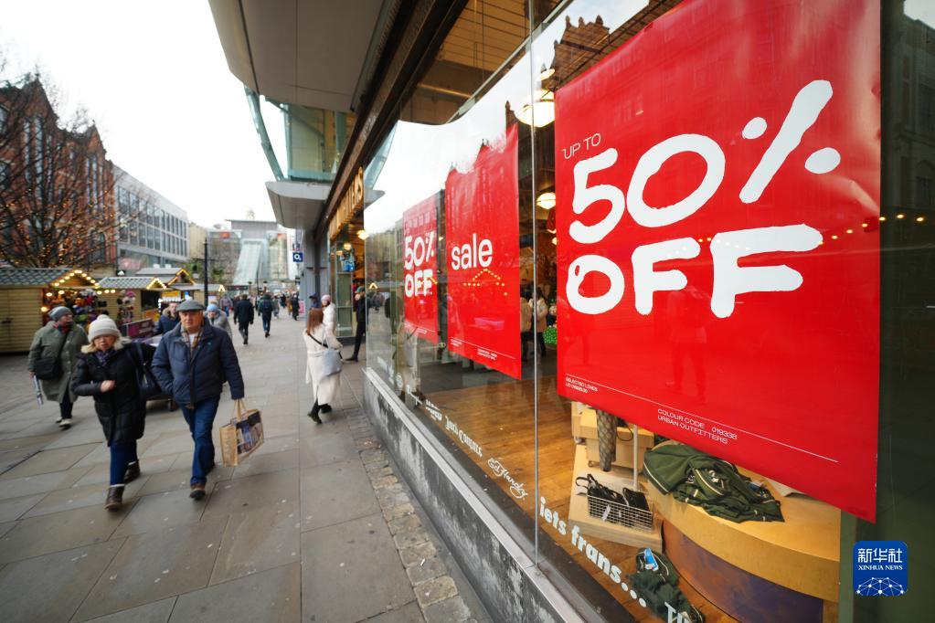 12月13日,人們走過英國曼徹斯特街上的促銷廣告。