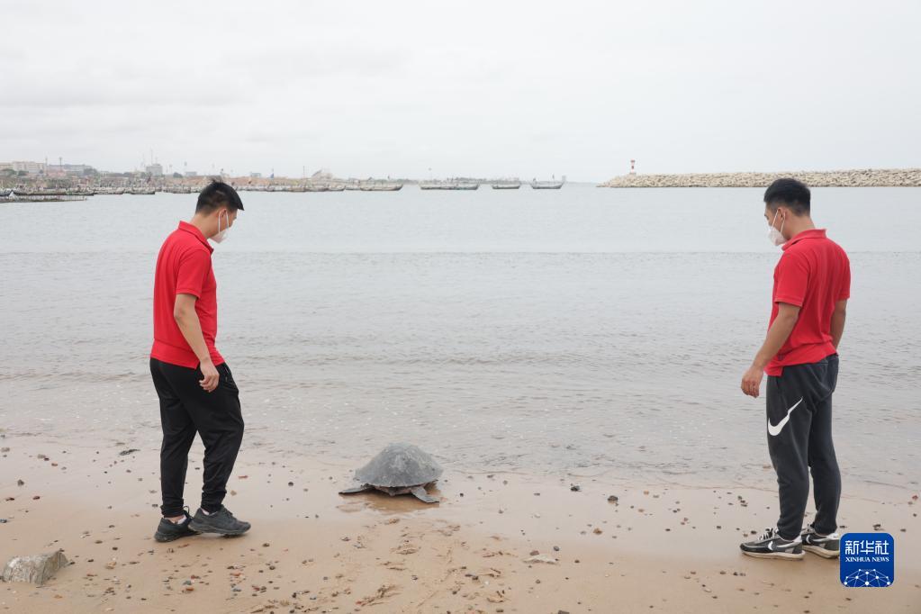 11月4日,工作人員在加納首都阿克拉中國援建加納漁港綜合設施項目施工現場將海龜放歸大海。