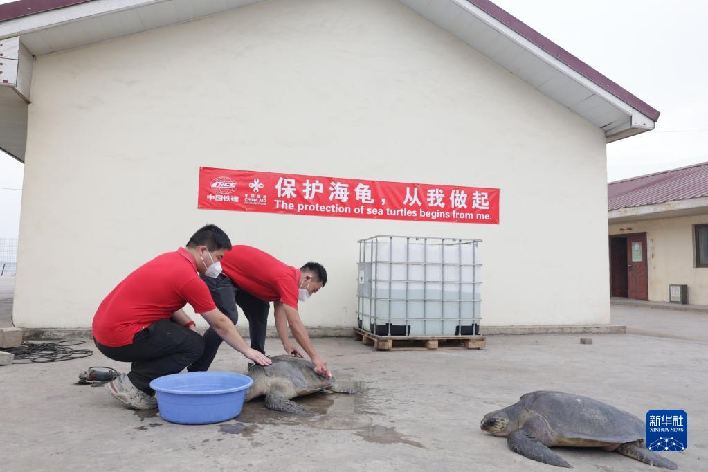 11月4日,工作人員在加納首都阿克拉中國援建加納漁港綜合設施項目施工現場照料需要救助的海龜。