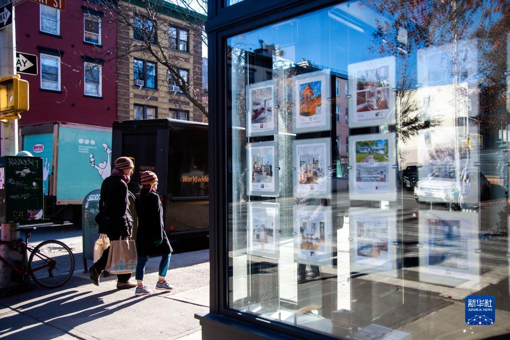 12月13日,人們從美國紐約一家房產中介的廣告旁走過。