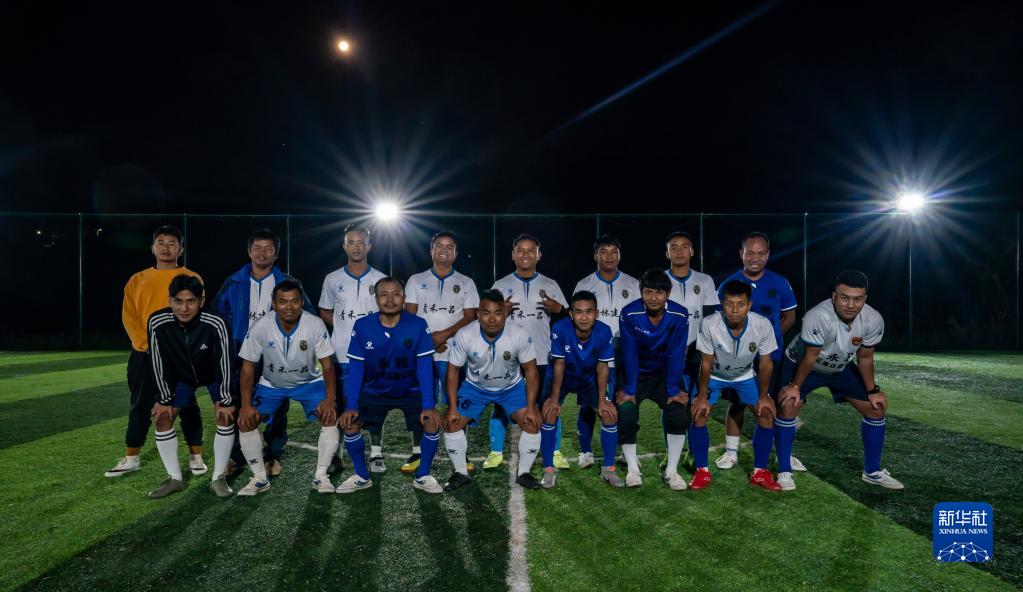 云南省滄源佤族自治縣龍乃村足球隊隊員與永和村足球隊隊員在賽后合影(12月7日攝)。