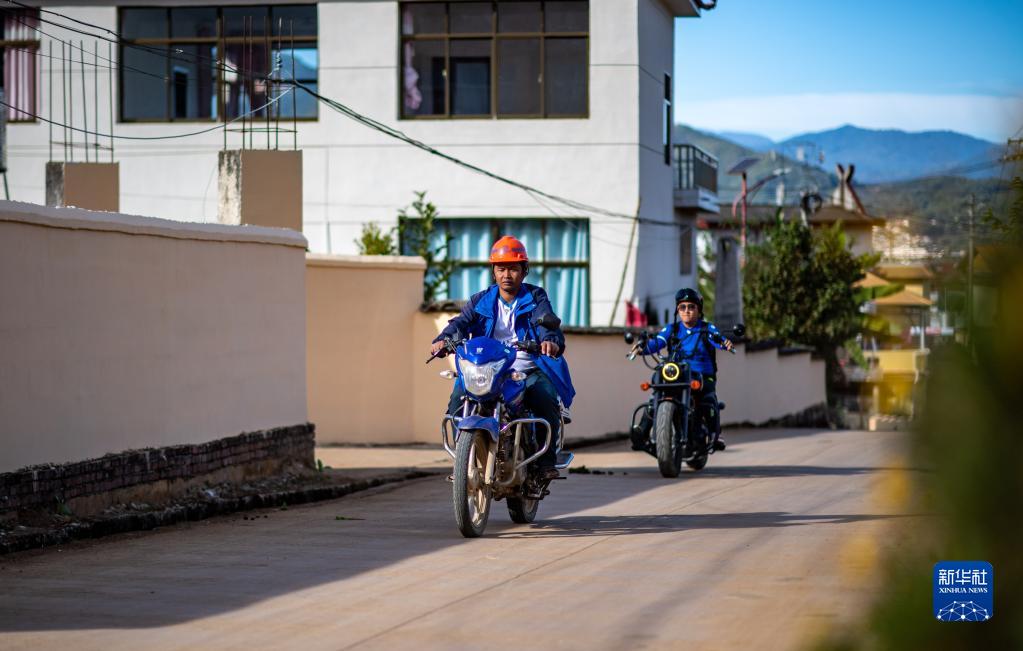 云南省滄源佤族自治縣龍乃村首任足球隊隊長鮑志昆(前)騎著摩托車準備去球場踢球(12月7日攝)。