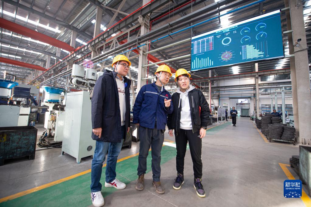 12月14日,浙江恒久傳動科技股份有限公司負責人(中)在企業生產車間內與陶朱街道駐企指導員交流企業生產經營情況。