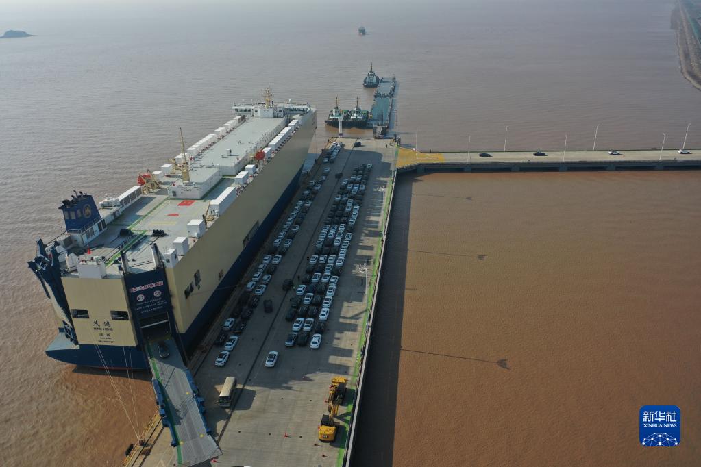 一艘滾裝船??吭谡憬瓕幉ㄖ凵礁勖窎|碼頭,裝運的汽車從船內駛出(12月13日攝,無人機照片)。