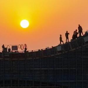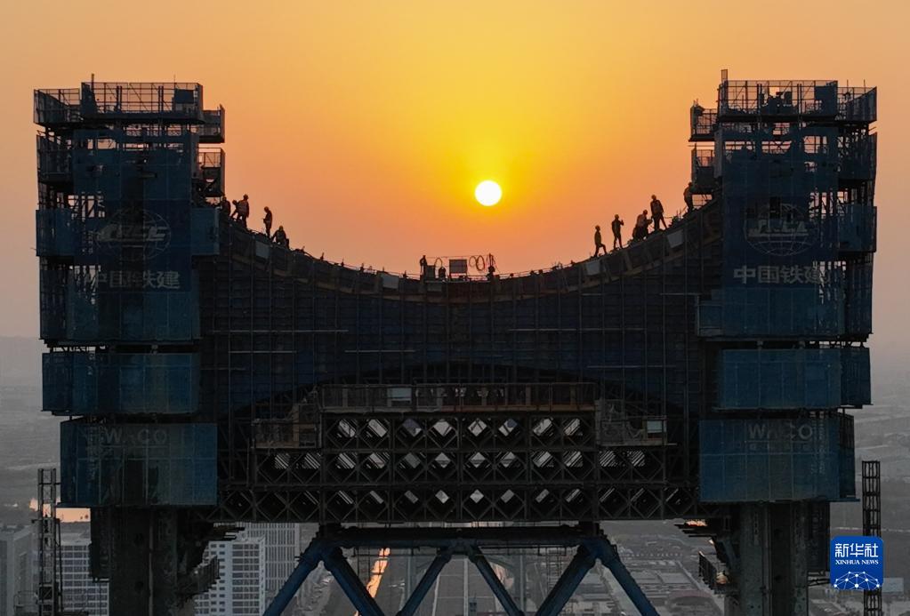 12月14日,工人在跨襄陽北編組站大橋T3主塔上施工(無人機照片)。