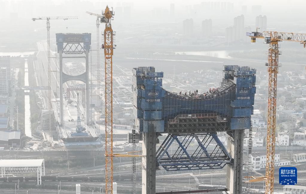 12月14日,工人在跨襄陽北編組站大橋T3主塔上施工(無人機照片)。新華社記者 程敏 攝
