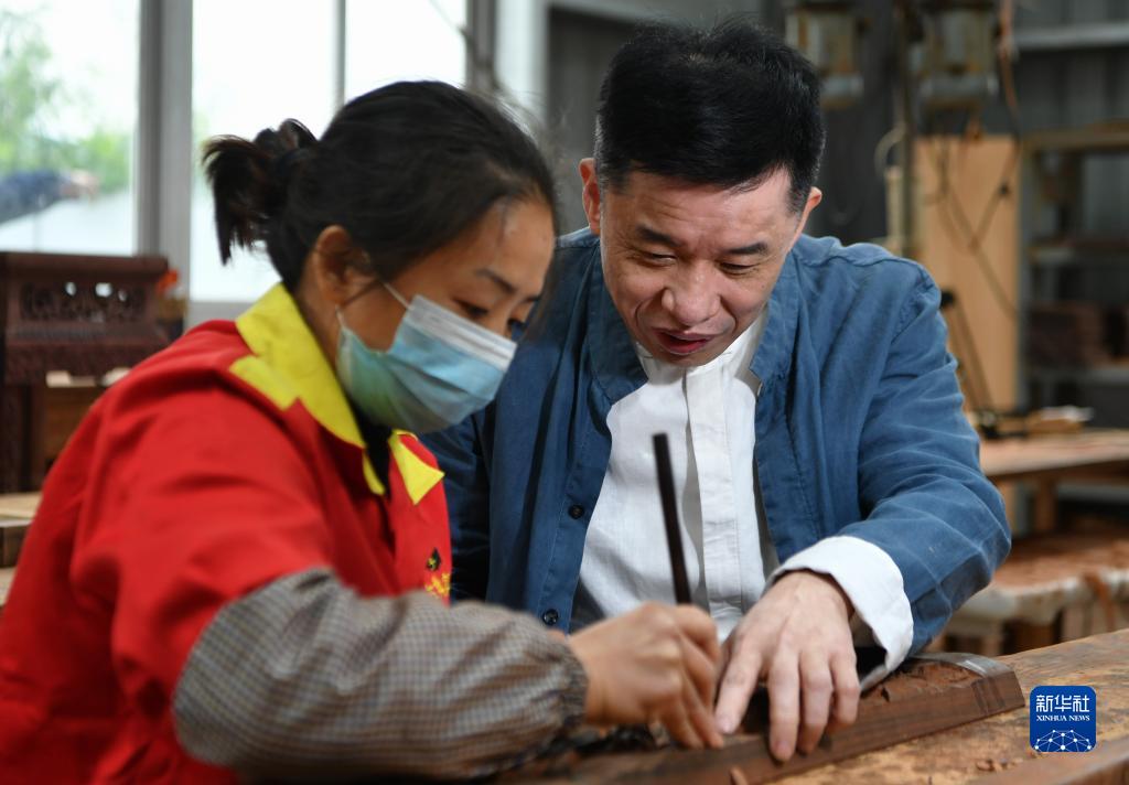 12月14日,古典家具技藝傳承人陳玉樹(右)指導員工進行雕刻。