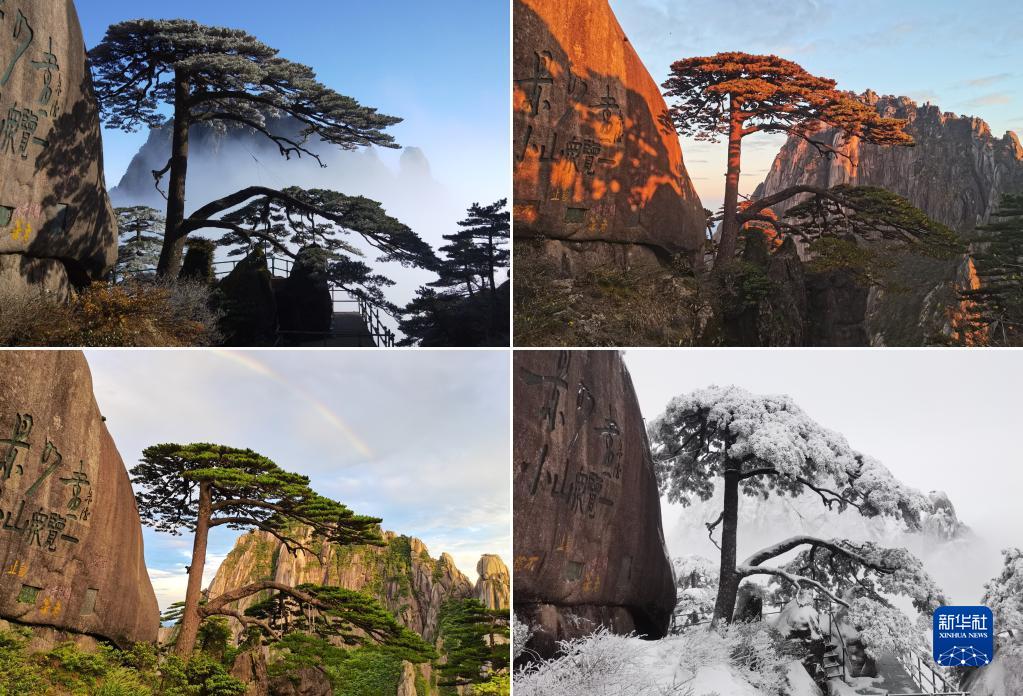 這是胡曉春拍攝的黃山迎客松(拼版照片,拍攝時間上左為2018年1月5日攝,上右為2020年10月13日攝,下左為2021年7月20日攝,下右為2022年2月18日攝)。