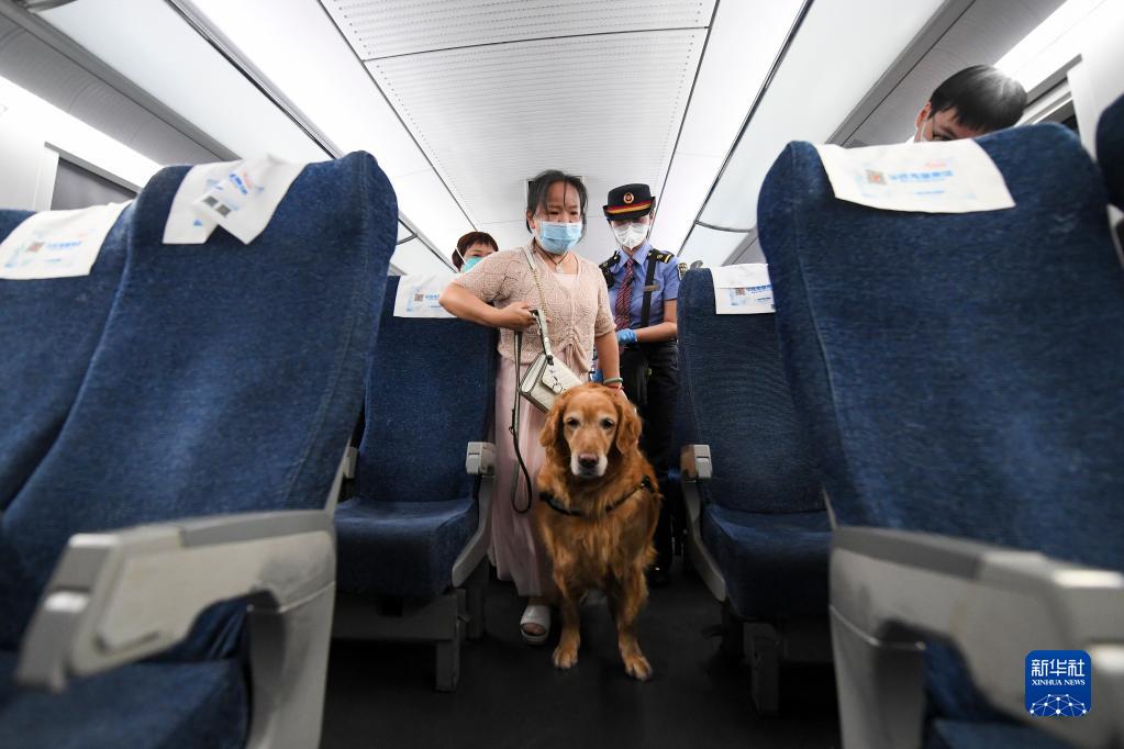 這是8月19日,在河源東到深圳北的G2267次車上,視障人士張莉和導盲犬滿悅在列車長李雙(左三)幫助下準備下車。