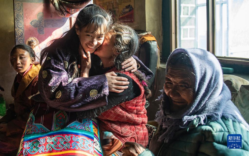 這是1月18日,在西藏當雄縣納措鄉甲嘎村,放寒假回家的江蘇食品藥品職業技術學院中藥學專業大學生旦增卓瑪(左二)和母親邊卓說悄悄話。