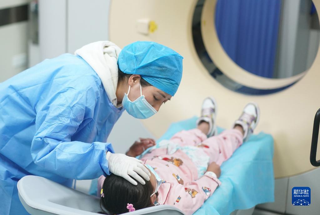 這是5月12日,在位于江蘇省南京市的南京醫科大學第二附屬醫院,護士安慰準備接受CT增強檢查的西藏先天性心臟病小患者達瓦卓瑪。