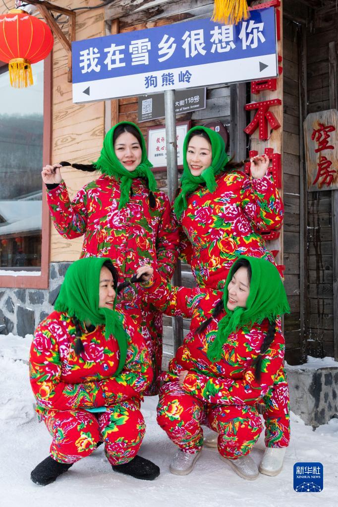 12月14日,游客租借服裝在雪鄉景區內留影。