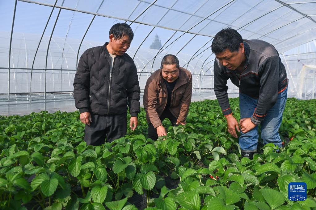 12月15日,在建德市乾潭鎮的草莓產業“共富工坊”大棚內,草莓種植大戶仇小明(中)指導種植戶注意溫度和濕度變化。