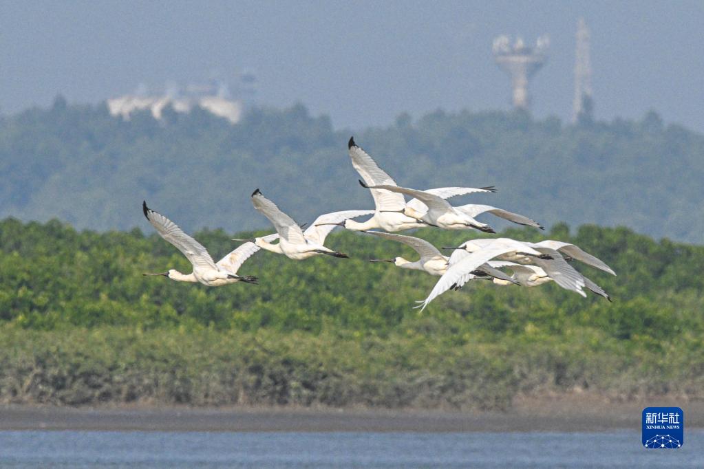 一群黑臉琵鷺在海南儋州灣上空飛翔(12月13日攝)。
