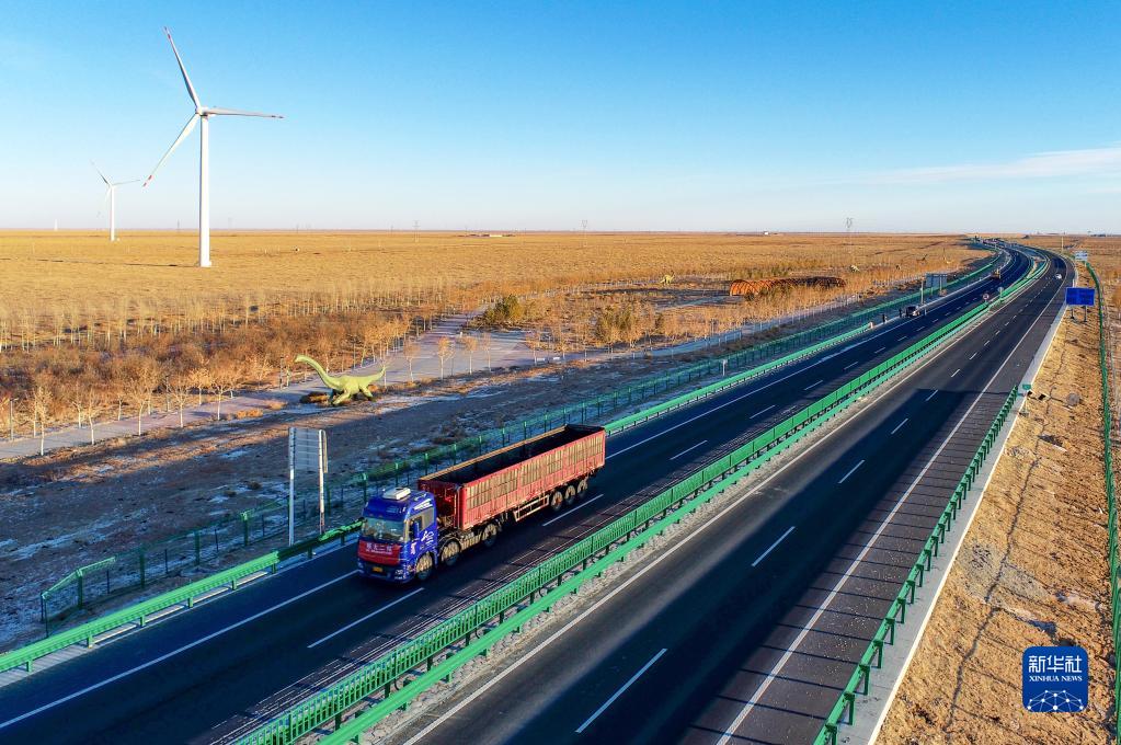 12月16日,車輛在二廣高速內蒙古二連浩特至賽漢塔拉段上行駛(無人機照片)。