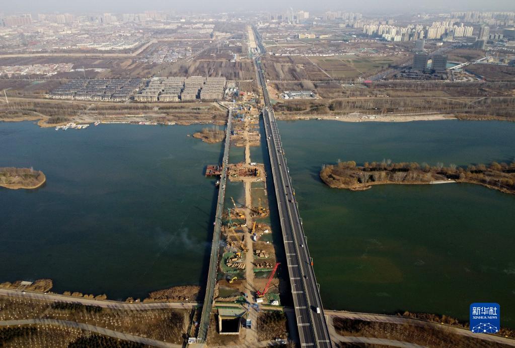 12月15日,工人在石家莊市復興大街滹沱河特大橋建設工地施工(無人機照片)。