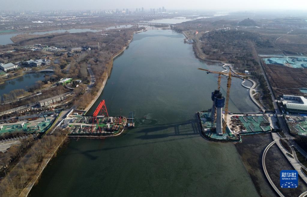 12月15日,工人在石家莊市太平河片區工程學府路東延跨太平河大橋建設工地施工(無人機照片)。
