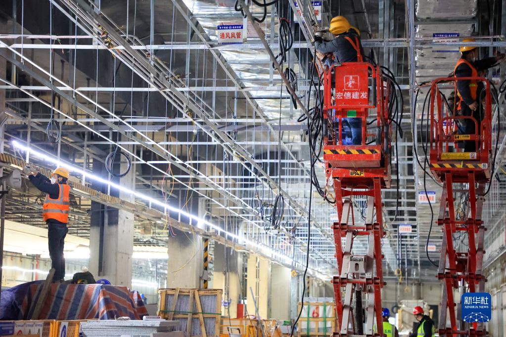 12月16日,中鐵五局建設者在貴陽軌道交通三號線東風鎮站內施工。