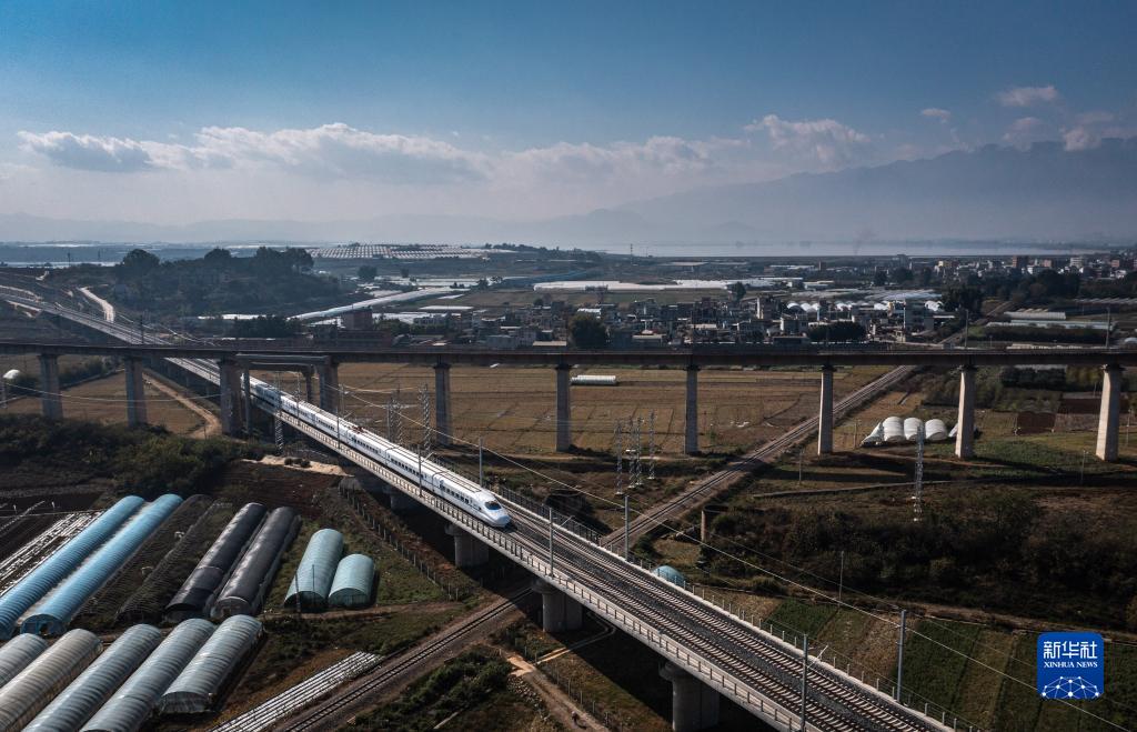 12月16日,列車行駛在與昆玉河鐵路(上)、滇越鐵路(底層)相互交叉的彌蒙高鐵線(中)(無人機照片)。