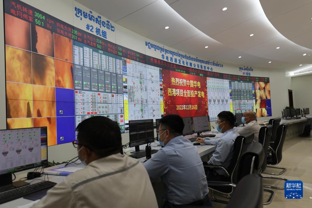 12月16日,工作人員在柬埔寨西哈努克港燃煤電站集控中心工作。