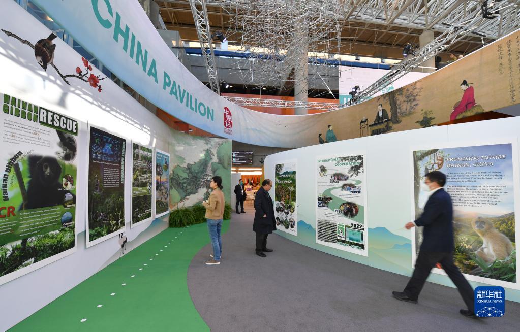 12月13日,與會者在加拿大蒙特利爾《生物多樣性公約》第十五次締約方大會(COP15)第二階段會議的中國角海南日活動上參觀。新華社記者 連漪 攝