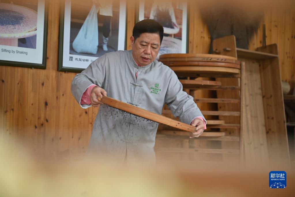 12月16日,在福州茉莉花茶制茶工坊,福州茉莉花茶傳統窨制工藝大師傅天甫進行制茶的第一道工序“平”?!捌健本褪怯枚嗫字裰破泛Y茶,將毛茶分出大小、粗細。