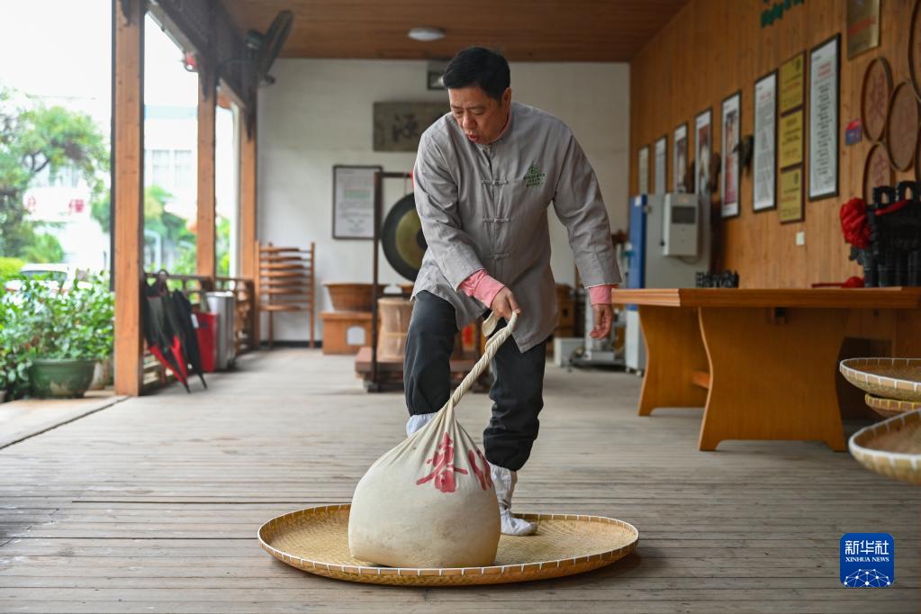 12月16日,在福州茉莉花茶制茶工坊,福州茉莉花茶傳統窨制工藝大師傅天甫進行制茶的第三道工序“蹚”?!佰彙笔菍⒔涍^“平”“抖”工藝分出的茶葉裝入布袋,用腳來回斜度蹚下,改變茶葉的大小、長度。