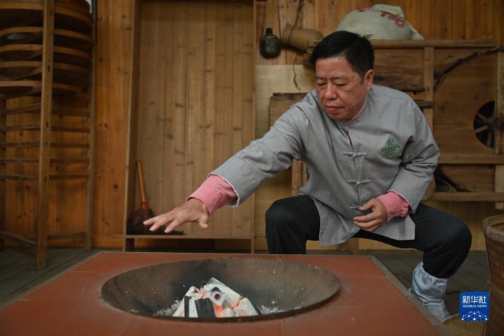 12月16日,在福州茉莉花茶制茶工坊,福州茉莉花茶傳統窨制工藝大師傅天甫在進行第五道工序“烘”之前感受火的溫度。