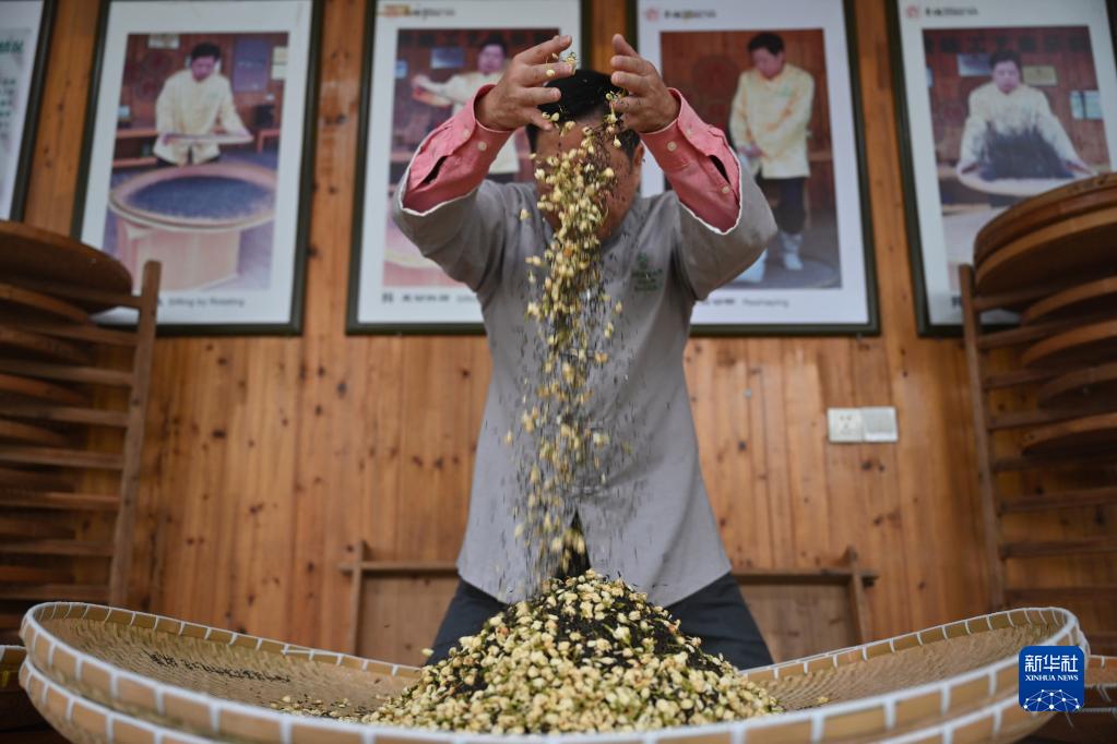 12月16日,在福州茉莉花茶制茶工坊,福州茉莉花茶傳統窨制工藝大師傅天甫進行制茶的第六道工序“窨”。