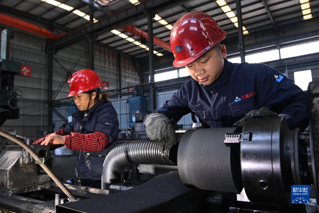 12月17日,工人在貴州省黔南布依族苗族自治州福泉市一家新型材料制造企業加工訂單配件。
