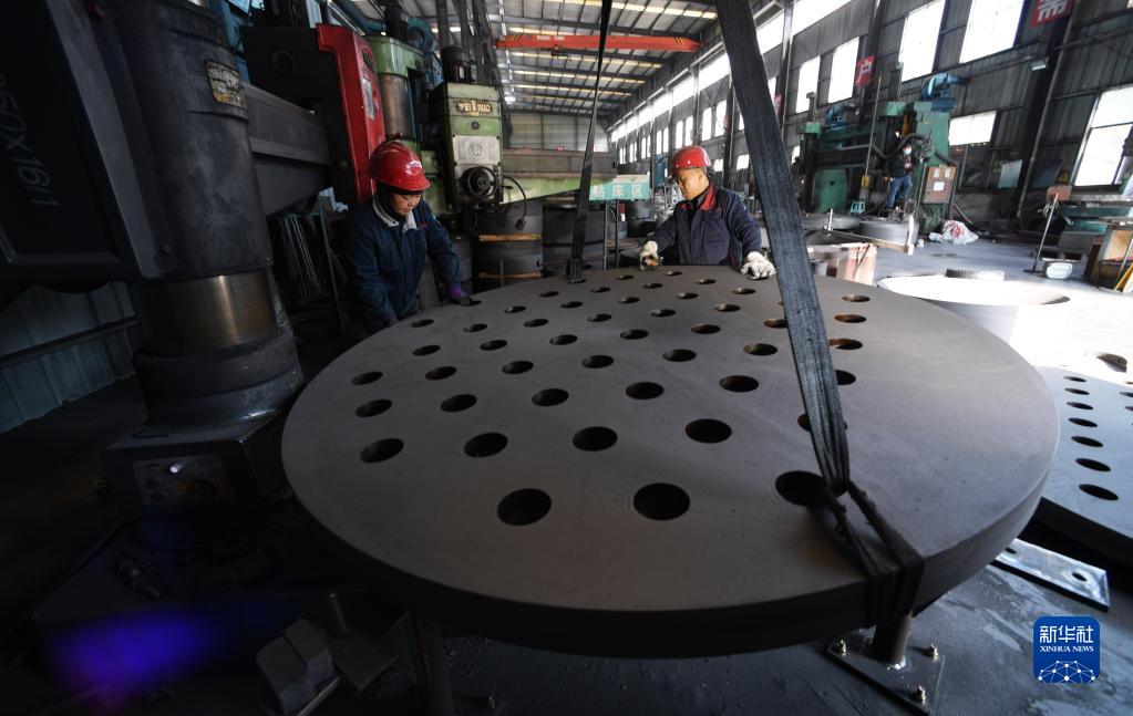 12月17日,工人在貴州省黔南布依族苗族自治州福泉市一家新型材料制造企業吊運配件。