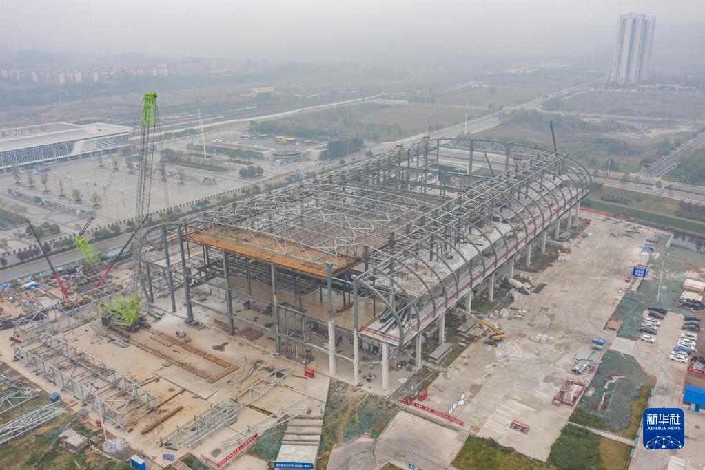這是12月16日拍攝的重慶市永川區會展中心項目施工現場(無人機照片)。